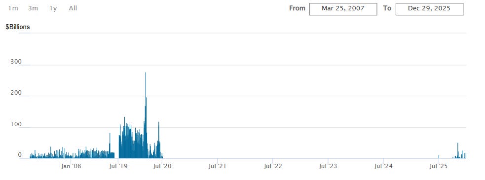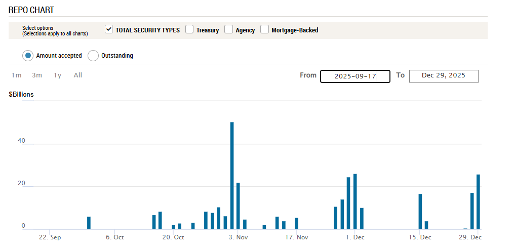 Now before 2025, there was ZERO usage of REPO! Meaning that there was liquidity in the system. Now, there’s REPO usage, especially event since September meaning that there’s strains in liquidity.