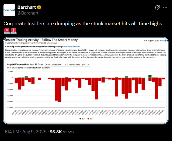 The same play is playing out today. Last August, a report from Barchart on Twitter/X said that insiders were dumping as the stock market was at all time highs.